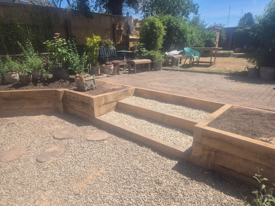 "Phil transformed our new build, sloping ‘blank canvas’ to a split level garden with a patio, raised borders and golden gravel. He understood our requirements, made sensible suggestions and delivered what he promised.