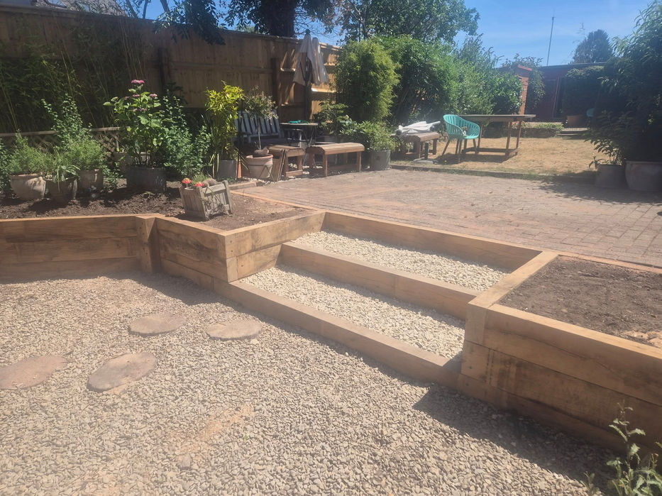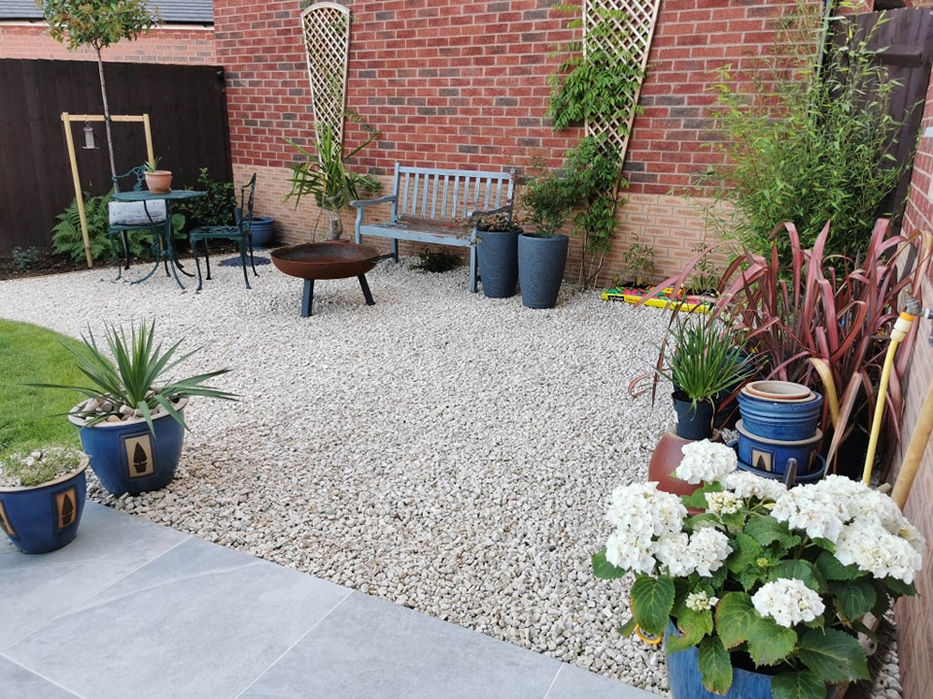 "Phil transformed our new build, sloping ‘blank canvas’ to a split level garden with a patio, raised borders and golden gravel. He understood our requirements, made sensible suggestions and delivered what he promised.